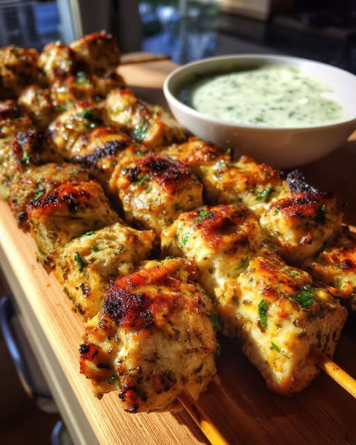 BROCHETTES DE POULET MARINÉ AU YAOURT, CITRON ET ZAATAR, GRILLÉES À LA PLANCHA AVEC SAUCE BLANCHE À LA MENTHE