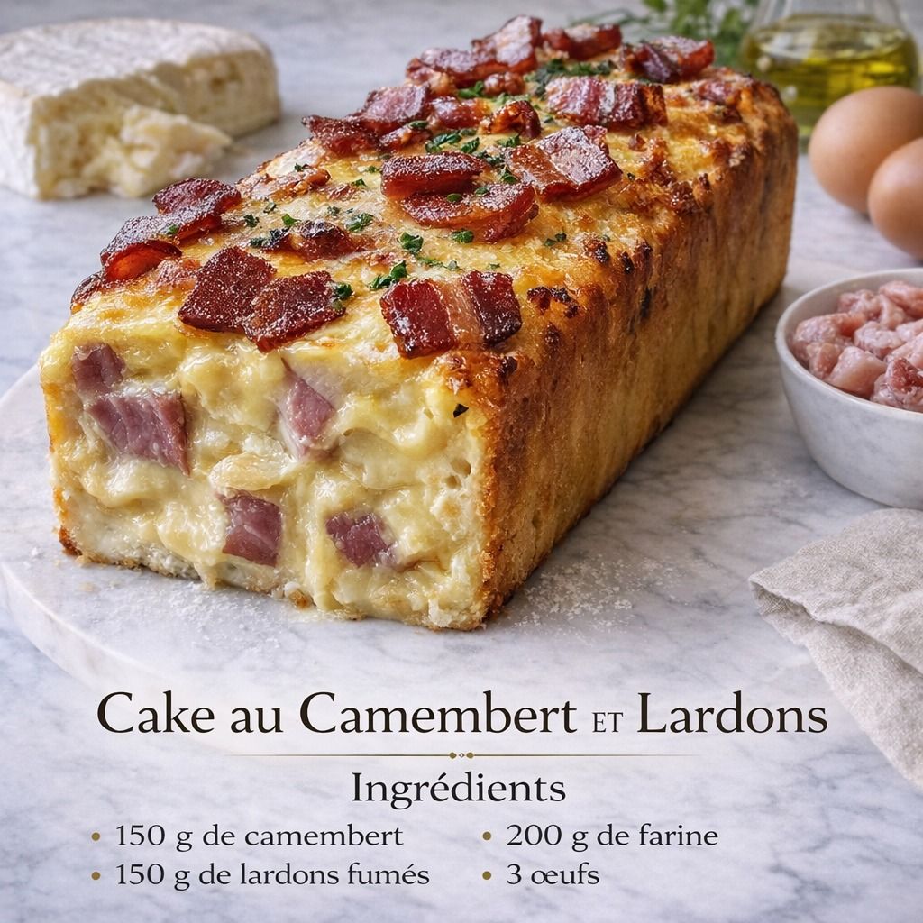 Le cake camembert et lardons est une recette savoureuse et généreuse, parfaite pour les amateurs de fromage et de plats conviviaux. Moelleux à l’intérieur et doré à l’extérieur, il associe la douceur du camembert fondu à la gourmandise des lardons grillés. Facile à préparer, il se déguste aussi bien chaud que froid, en apéritif, en entrée ou en plat principal accompagné d’une salade.