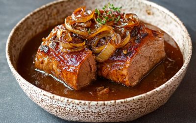 Rôti de Porc Fondant au Miel et Oignons Caramélisés