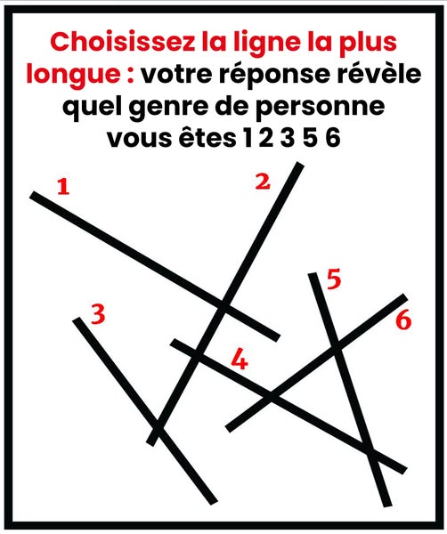 À première vue, c’est un petit jeu sans conséquence : six lignes noires, numérotées de 1 à 6, dessinées côte à côte. Votre mission ? Indiquer laquelle vous semble la plus longue. Facile, non ? Et pourtant… derrière ce choix apparemment anodin se cache un test fascinant sur votre perception et votre façon d’aborder la vie. Alors, prête à découvrir ce que votre intuition révèle sur vous ?