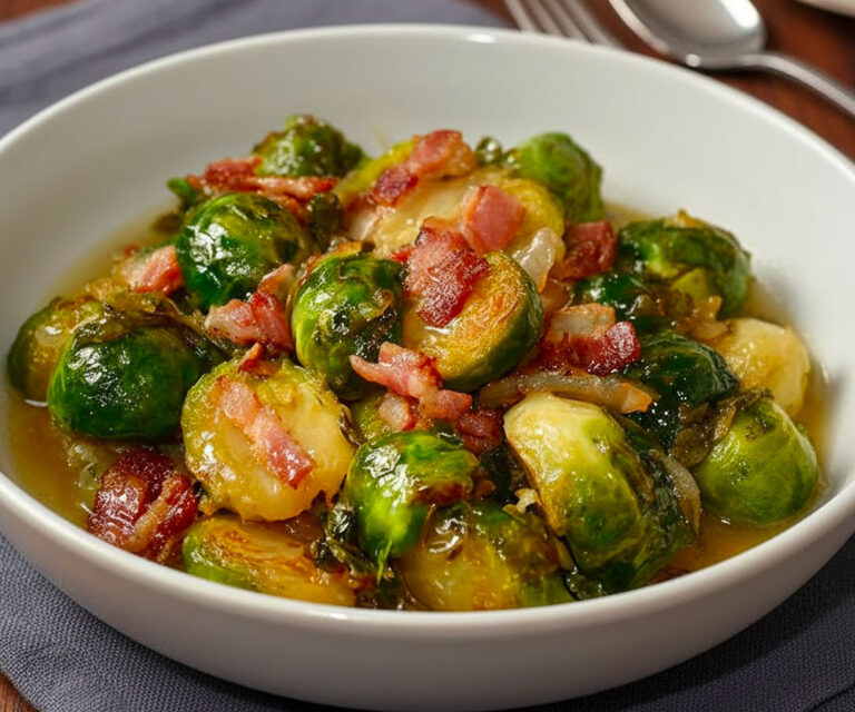 Cette recette est la preuve que les choux de Bruxelles peuvent devenir la star d’un plat, et non pas un simple accompagnement triste. Leur texture légèrement croquante et leur goût prononcé s’équilibrent à merveille avec la richesse du lard croustillant et les oignons fondants. Une touche d’ail, un peu de beurre… et voilà une explosion de saveurs rustiques et chaleureuses.