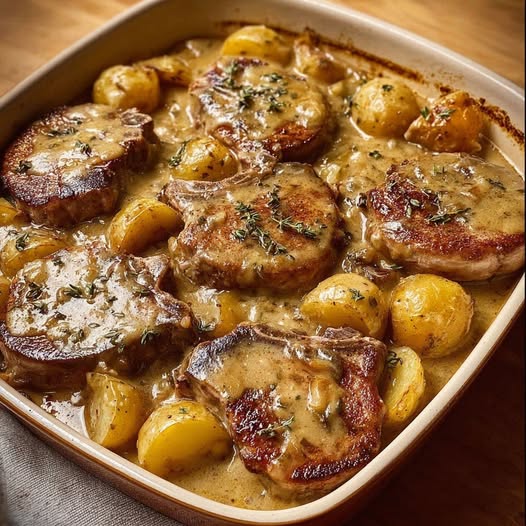 Des côtelettes de porc dorées mijotées lentement avec des pommes de terre dans une sauce crémeuse, aromatisée au laurier, thym et paprika. La cuisson à feu doux permet d’obtenir une chair tendre et juteuse. Les pommes de terre absorbent les saveurs riches du bouillon, tandis que la crème et le beurre apportent onctuosité et douceur. Un plat familial généreux, à servir nappé de sauce et parsemé de persil frais pour une touche de fraîcheur et de couleur.