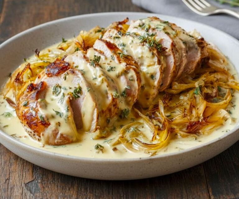 Le filet mignon de porc, tendre et juteux, est une viande souvent sous-estimée en cuisine. Pourtant, bien préparé, il devient la star de nos assiettes. Dans cette version, il est accompagné d’oignons longuement confits, presque caramélisés, qui apportent une douceur irrésistible et un parfum délicatement sucré.