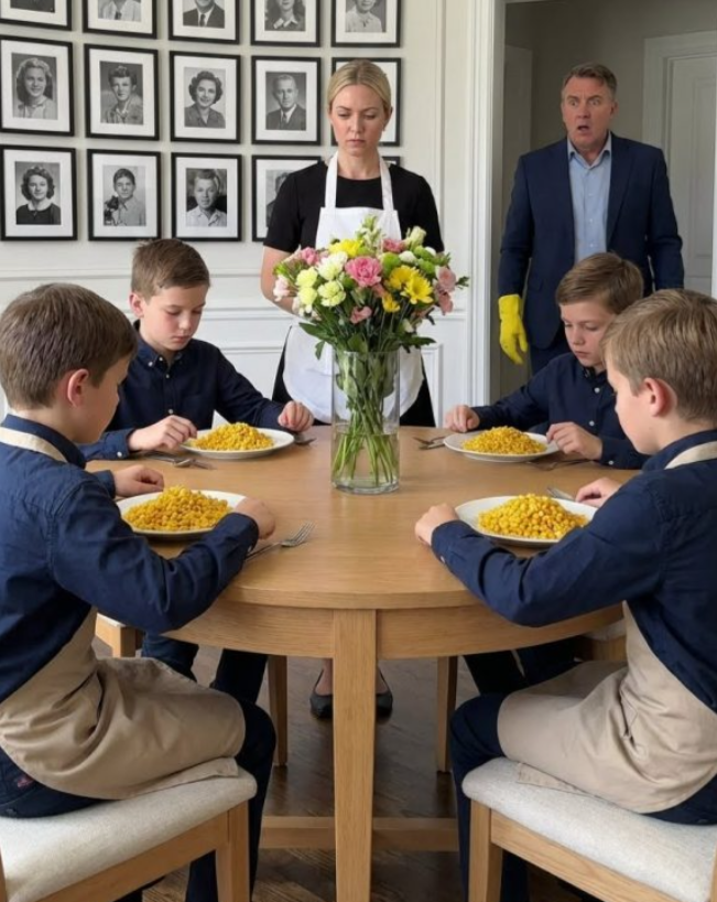 Elena, la jeune femme de chambre en uniforme bleu et blanc impeccable, ne faisait ni l'entretien de l'argenterie ni le ménage. Assise à table , elle nourrissait calmement quatre petits garçons identiques — âgés d'environ quatre ans — vêtus de vêtements rapiécés et de fortune.