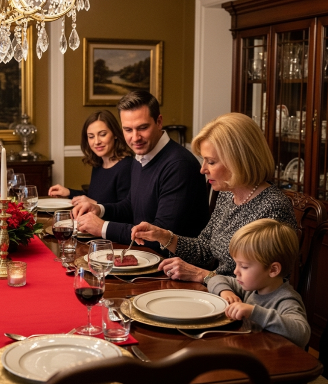 La table brillait comme une publicité pour les bonnes manières : un chemin de table cramoisi parfaitement droit, des couverts en argent alignés comme des soldats, huit assiettes d’un blanc immaculé scintillant sous un lustre en cristal à 4 000 dollars qui avait vu passer trois générations pour accomplir le rituel du « tout va bien ». Et puis il y avait le neuvième couvert – celui de mon fils – une absence déguisée en set de table.