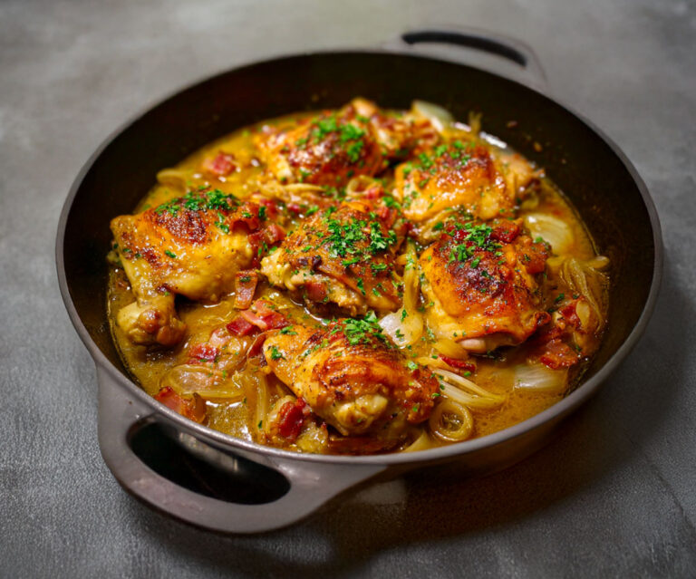 Ce plat tire son inspiration des traditions normandes, où le cidre est souvent utilisé en cuisine pour apporter une touche fruitée et légèrement acidulée aux plats salés. Associé à la crème fraîche et aux lardons fumés, il transforme de simples cuisses de poulet en une recette savoureuse et pleine de caractère. La cuisson lente permet à la viande de devenir ultra fondante, tout en laissant le temps aux arômes de se développer.