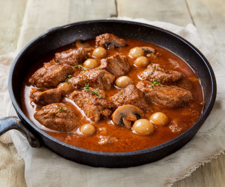 Ce plat familial met à l’honneur une viande tendre et savoureuse, mijotée longuement dans une sauce tomatée, agrémentée de champignons, d’oignons grelots, de vin blanc et d’aromates. Le secret de sa réussite réside dans une cuisson douce et prolongée, qui permet aux saveurs de se développer pleinement et à la viande de devenir fondante.